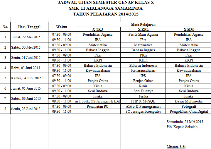 Jadwal Ujian Semester Genap Tahun Ajaran 2014-2015 28.5.15 Kelas X Kelas XI Samarinda, 28 Mei 2015Plh. Kepala SekolahMisran, S.Si Show Comments (0) Close Comment